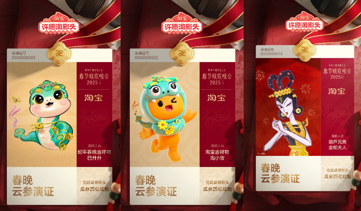 据悉,活动一上线,就有不少用户上平台上领取了自己的“云参演证”。甚至连春晚和淘宝的吉祥物、葫芦兄弟里的金蛇等各路IP都拥有了一张自己的春晚云参演证。有网友调侃,这恐怕是春晚历史上参演人数最多的一届了。